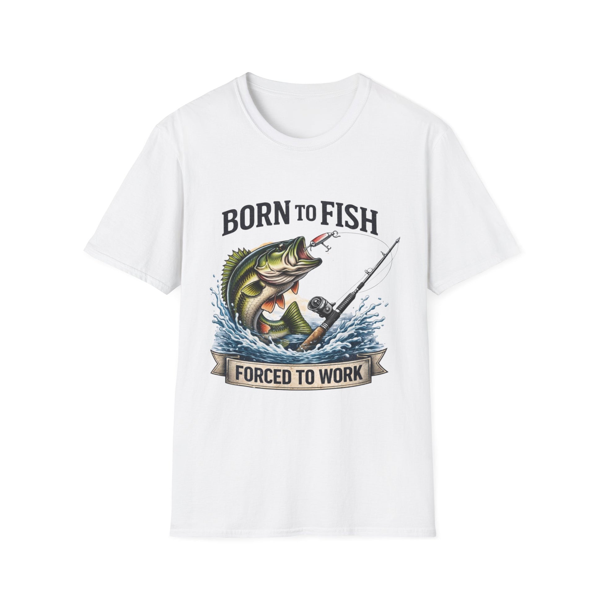 A lively bass jumps across the chest with the caption “Born to Fish — Forced to Work,” printed in crisp, vibrant colors that stand out cleanly against the neutral shirt. The straight, classic fit features a crew neckline and tear-away label, making it easy to layer under a flannel or wear on its own while fishing, boating, or relaxing outdoors.