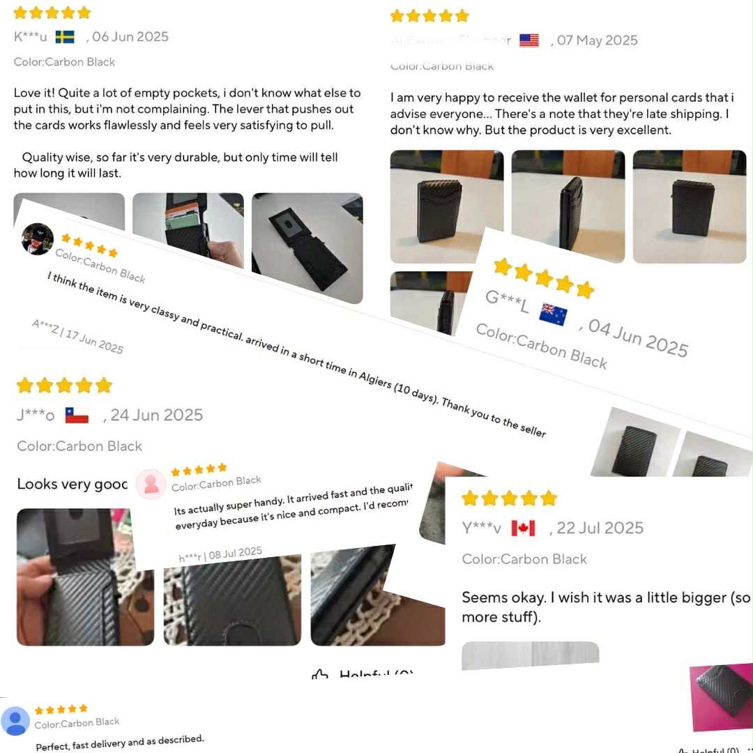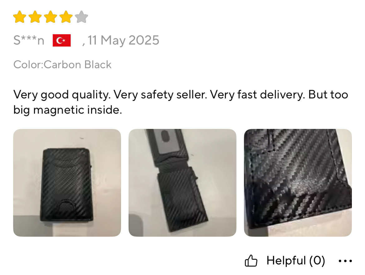 I like the carbon fiber look. Cards stay secure, and the trigger mechanism is smooth. Would love a slot for coins, but I get that it’s made to be minimal.